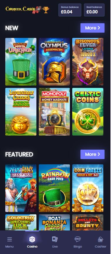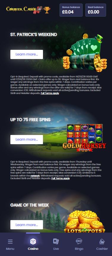 Conquer Casino doesn’t have a dedicated app. However, the mobile site is very well-optimised. It works perfectly in any smartphone browser. The layout is a bit “template-heavy,” which means it looks like many other ProgressPlay sites. It won’t win any design awards, but it is very easy to navigate. The search function is responsive. You can filter games by provider, which is a feature we wish every casino had.