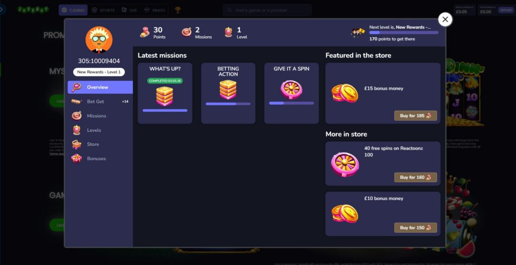 JeffBet is also known for a missions and points style rewards setup. Think leaderboard, tasks, and a store where you swap points for perks like bonus funds, spins, or cashback. It’s ‘always up’, so points you earn for depositing and betting will keep accumulating and you’ll always rise up the levels, never drop.