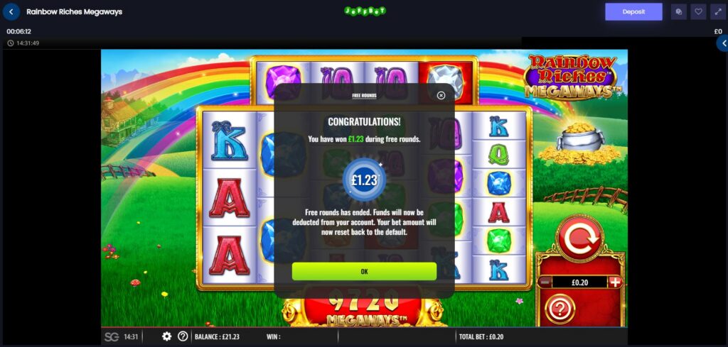 When we deposited, we instantly got a message instantly to take us to Rainbow Riches Megaways to use our 50 free spins, so you won’t have to dig around to figure things out. Our balance showed £20 too, with the 100% bonus added. We won £1.23 from our 50 free spins, so started our JeffBet life with £21.23 to play with.