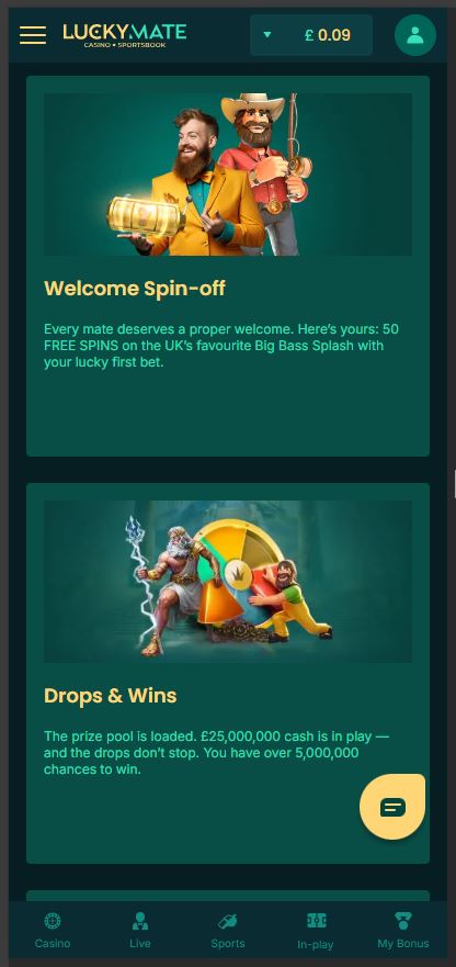 Lucky Mate has a small selection of casino and sports promos at any one time. Expect the usual mix of: